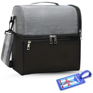 OCEANEVO 2 Compartment Insulated Lunch Bag with Luggage Tag, Tiffin Bag for Office with Handle and Shoulder Strap for Men and Women – 28 x 25 x 18 Cm – Grey